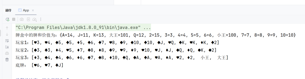 public PokerGame() {//空参构造 Collections.shuffle(list);//洗牌 // 发牌 ArrayList<String> player1 = new ArrayList<>(); ArrayList<String> player2 = new ArrayList<>(); ArrayList<String> player3 = new ArrayList<>(); ArrayList<String> dipai = new ArrayList<>(); for (int i = 0; i < list.size(); i++) { if (i >= list.size() - 3) { dipai.add(list.get(i)); } else if (i % 3 == 0) { player1.add(list.get(i)); } else if (i % 3 == 1) { player2.add(list.get(i)); } else if (i % 3 == 2) { player3.add(list.get(i)); } } order(player1); order(player2); order(player3); order(dipai); // 打印玩家牌和底牌 System.out.println("玩家1:" + player1); System.out.println("玩家2:" + player2); System.out.println("玩家3:" + player3); System.out.println("底牌: " + dipai); }